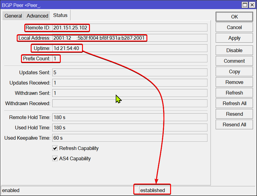 En caso de que la sesión no se establezca y este en algún estado como open, active o algún estado distinto de ESTABLISHED debemos revisar los parámetros de configuración.