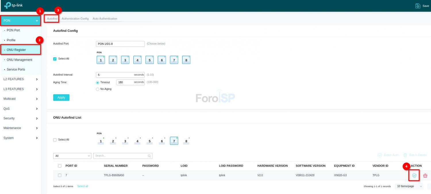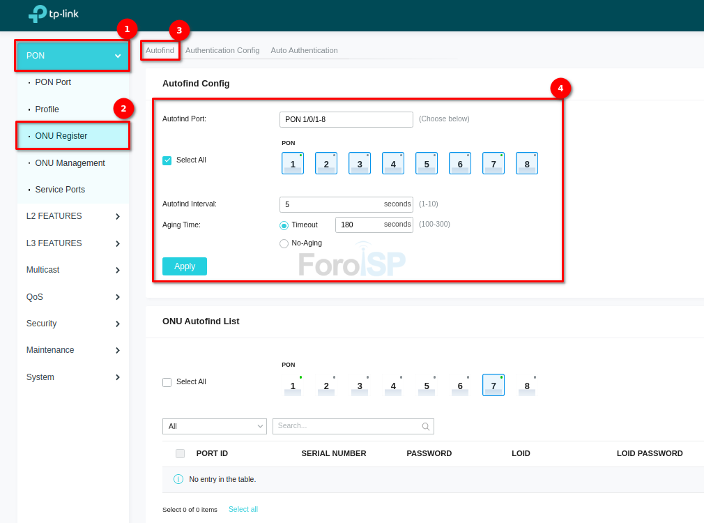 Una vez haya iniciado sesión en la OLT, usualmente el modo de autorización está de forma manual y la función Auto find se encuentra configurada, compruebe esta información para el puerto PON correspondiente, en este caso usaremos el 7. Colóquese en: