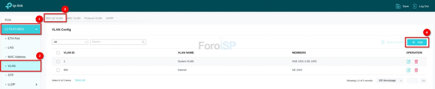 Creamos la VLAN correspondiente y darle tag al puerto correspondiente, en este ejemplo crearemos la VLAN 800 y daremos tag al puerto 3, colóquese en: