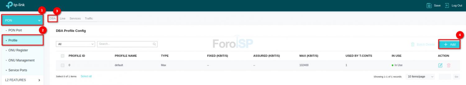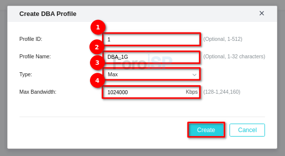 Ahora, es necesario crear un DBA Profile, para este ejemplo será de 1024000 (1G). La OLT cuenta ya con 1 DBA Profile así que podemos poner el ID 1 en adelante y que no se repita. Colóquese en: