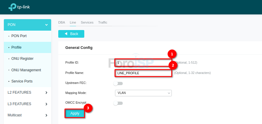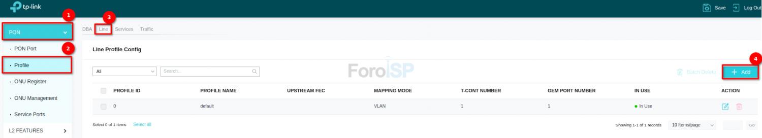 La OLT ya cuenta con un Line Profile creado, así que nosotros usaremos el ID 1. Colóquese en: