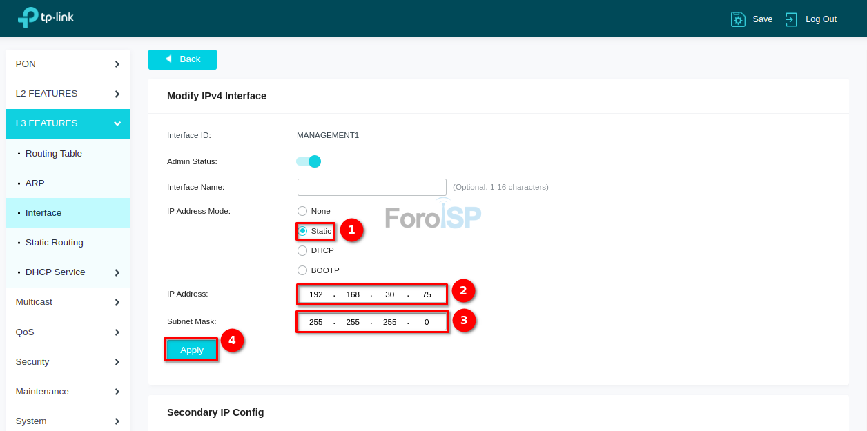 Utilizaremos la ip 192.168.30.75, esto permitirá acceder a la interfaz utilizando la Ip de administración y ya no la Ip por default. Colóquese en: