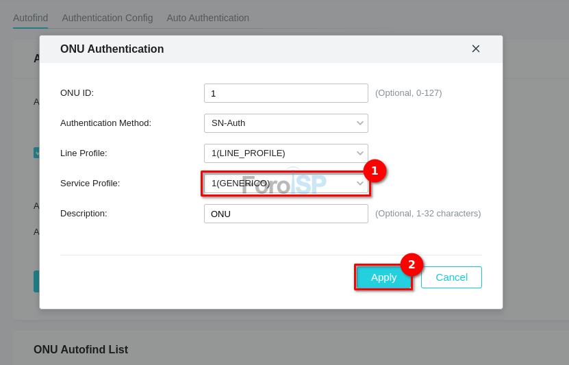 En la lista de Onus para autorizar, antes de confirmar la ONU debe seleccionar el Service Profile que se le agregara al equipo, ubique la ONU en: