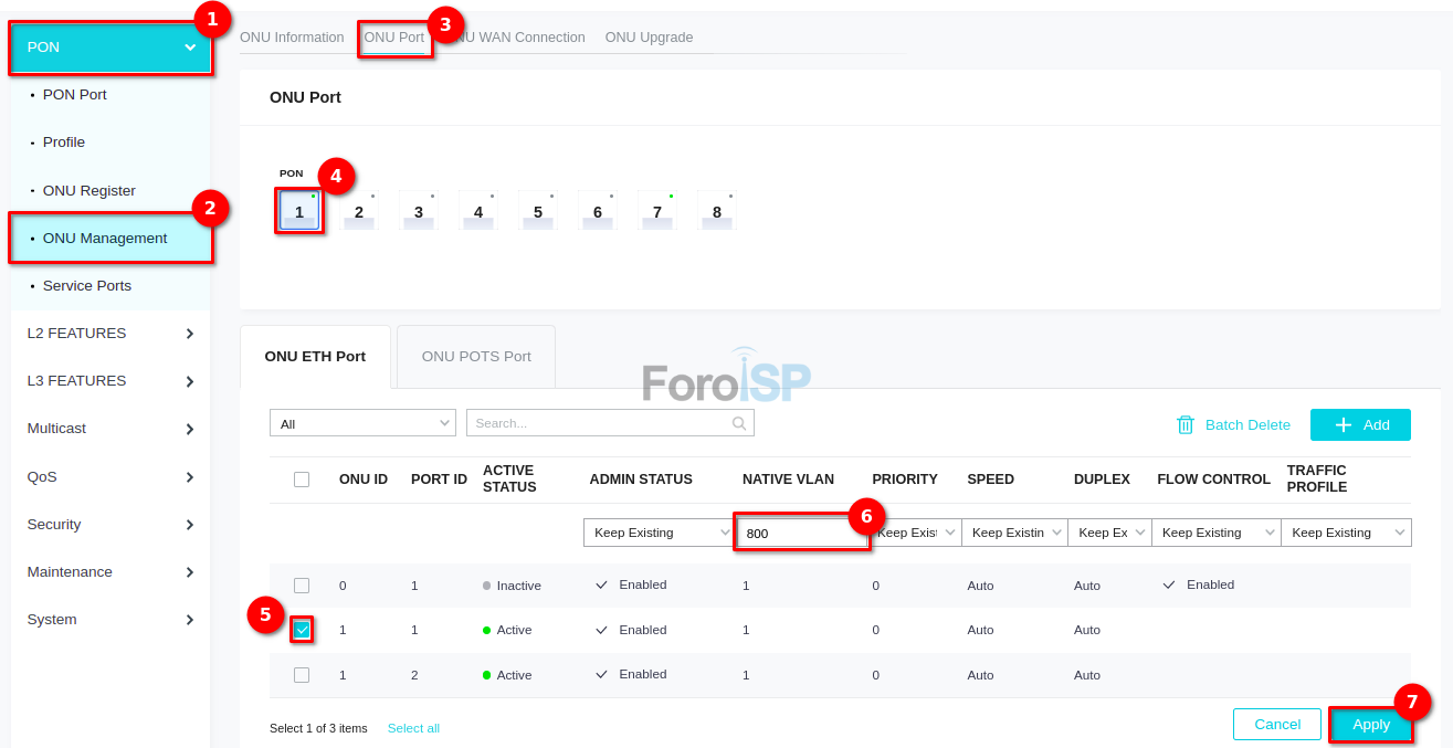Después de autorizar la ONU, en caso de utilizar alguna VLAN vamos a "vincularla" a los puertos correspondientes, para esto primero colóquese en: