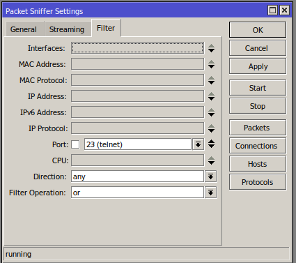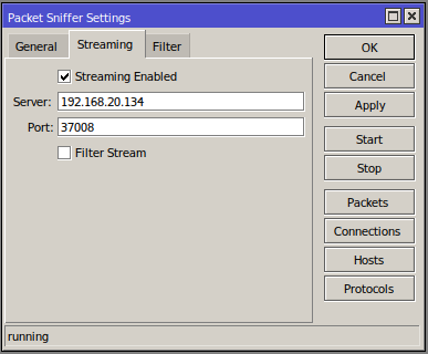 en using this filter, tendremos que filtrar hacia el puerto y protocolo del dispositivo A, que fueron los datos que se colocaron en la pestaña de streaming de Packet sniffer en mikrotik.