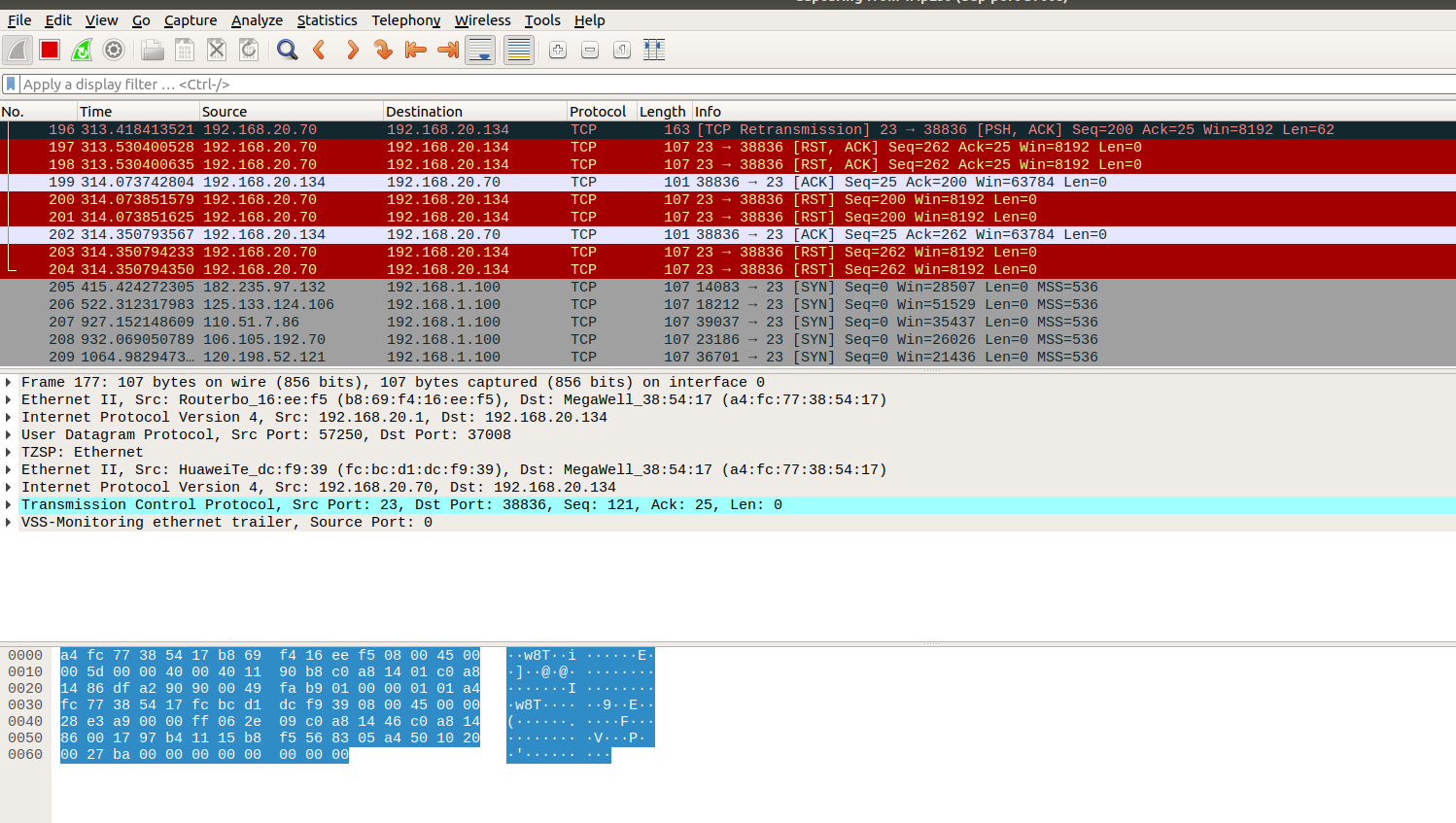 y con esto ya estamos supervisando y capturando todo del trafico del dispositivo A filtrando solamente en el puerto 23, como se especifico en el paso 2 en la pestaña filter de la herramienta Packet sniffer del mikrotik, si en tu caso quisieras ver todo el trafico de todos los puertos se deja vació esa configuración.
