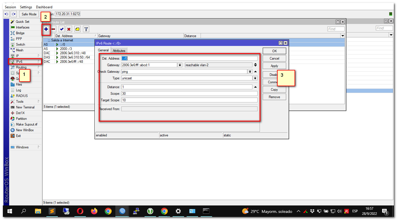 Apuntaremos todo el tráfico hacia la IPv6 configurada en nuestro switch Huawei. Esa IPv6 de Switch Huawei la configuramos en el paso 4.