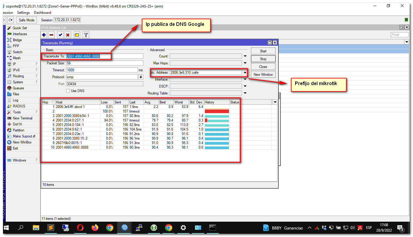 Usaremos un traceroute para comprobar que si estamos saliendo a Internet con nuestro pool de IPv6