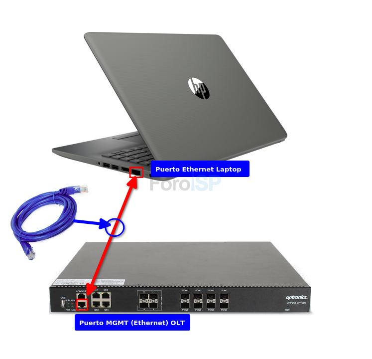 Utilizando el cable utp del puerto Ethernet de nuestra computadora al puerto MGMT de la OLT, una vez conectados debes asignar una ip estática (que se encuentre en el rango de la ip de la OLT) a nuestra computadora para poder alcanzarla, por ejemplo 192.168.8.10.