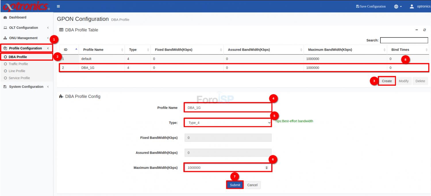 Ahora, creamos un DBA Profile, para este ejemplo será de 1000000 (1G). La OLT cuenta ya con 1 DBA Profile así que podemos poner el ID 2 en adelante y que no se repita. Colóquese en: