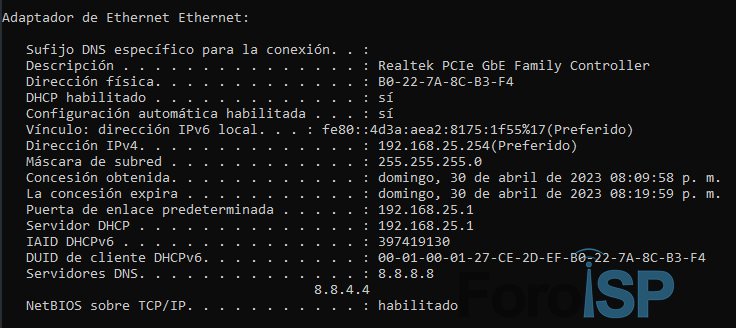 Bajo este esquema, nuestra laptop debe recibir una dirección ip del segmento 192.168.30.0/24. Sin embargo, con el Rogue DHCP Server conectado a una de las interfaces del switch, este propaga sus direcciones ip del servidor. Al verificar dentro de la laptop obtenemos como resultado una dirección ip 192.168.25.254, esta ip no nos permite navegar por internet.