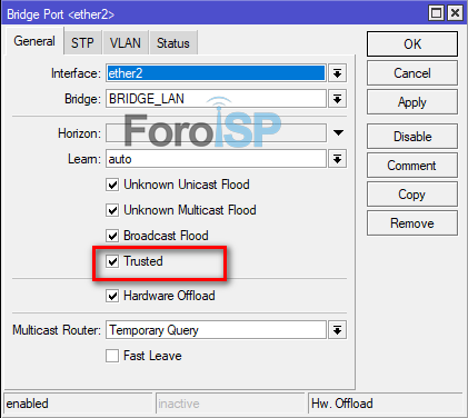 3El puerto ether2 debemos definirlo como puerto confiable, pues conecta con nuestro servidor DHCP autorizado.