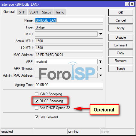 5Finalmente, activamos la función de DHCP Snooping dentro de la interfaz bridge. Adicionalmente, al activar la casilla nos aparecerá la opción 82 de DHCP, esta es una medida adicional en donde se puede identificar el servidor DHCP autorizado mediante un ID de identificación. Para esta práctica no se hará uso de ella.
