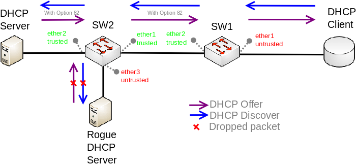 4Los demás puertos los definimos como no confiables porque no conectar con el servidor autorizado. Cabe aclarar que si un nodo conecta con otro switch que conecta con otro nodo, debemos colocar ese puerto confiable para que reenvié los mensajes DHCP hacia el otro switch.