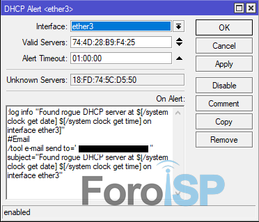 En este caso, como el servidor DHCP esta montado sobre la interfaz ether3 de mi router, puedo indicar en un alert cual el la dirección mac de la interfaz donde tengo montado el servidor DHCP, de esa forma el sistema sabrá que si hay mensajes DHCP provenientes de otra dirección mac, será tomada en cuenta como un DHCP Server intruso.