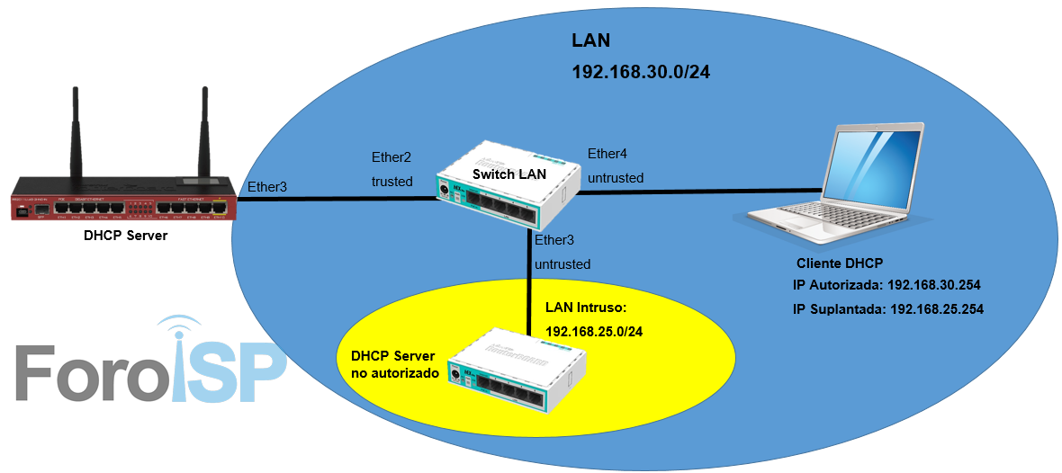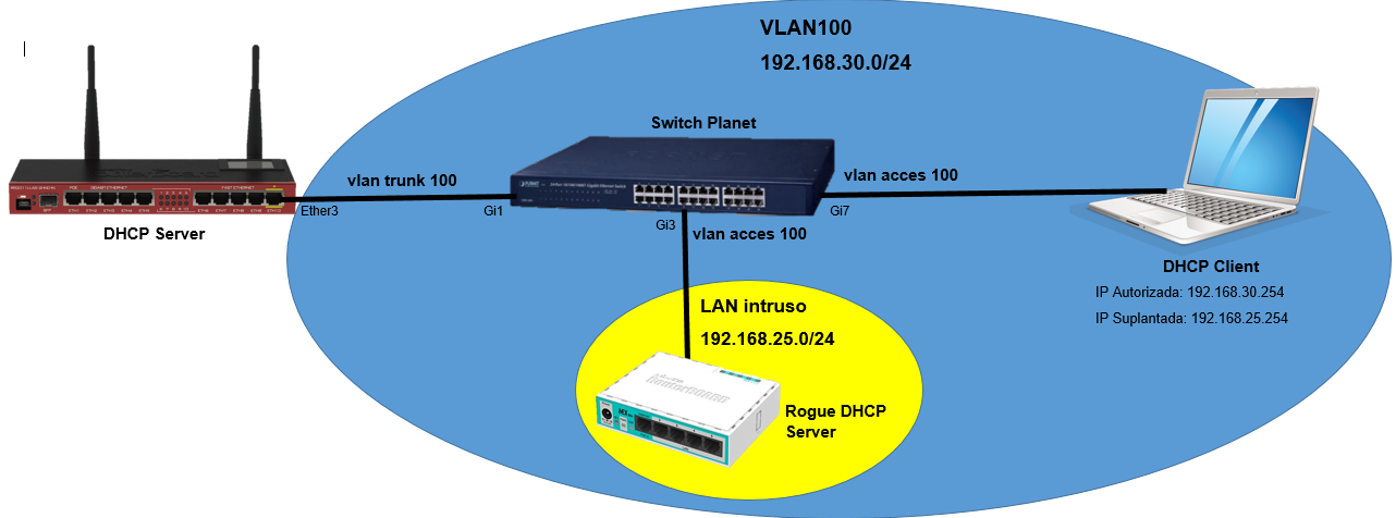 Por ello, lo que plantemos en el siguiente laboratorio, es una representación de un caso similar en donde mitiguemos el servidor DHCP intruso mediante la herramienta DHCP Snooping. Ya mencionamos el escenario de un Wisp, pero esto también puede pasar en una oficina, basta con que tengamos una diagrama de red similar para que se replique el error.
