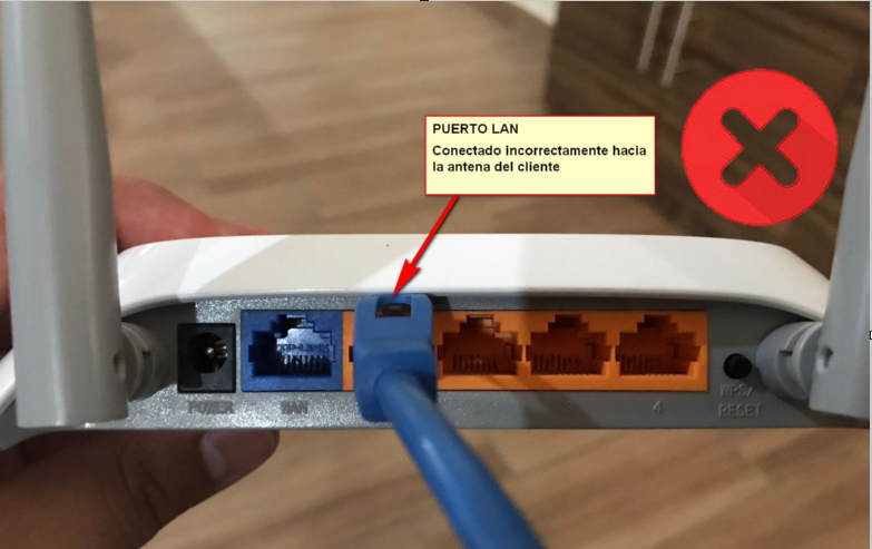 Pero qué pasa cuando nuestro cliente comente el error de desconectar el cable y al conectarlo se equivoca de puerto. Entonces el cable que va hacia la antena se conectar en uno de los puertos LAN: