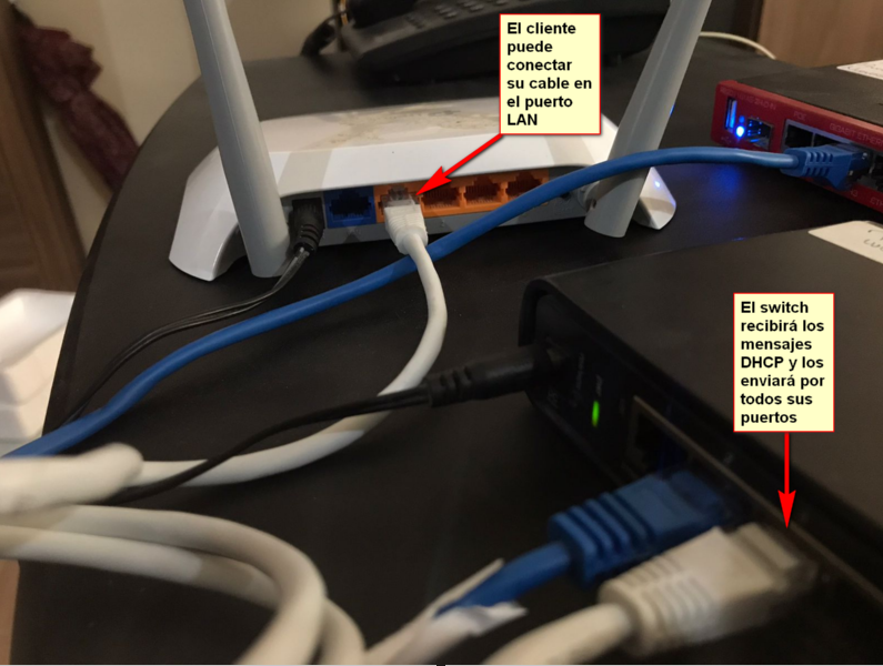 Ahora tenemos un problema en nuestra red, porque cuando el switch reenvíe los mensajes de DHCP Request puede que la asignación lo haga el módem TP-LINK en lugar de nuestro 2011. Los otros clientes que reciban estas ip no tendrán navegación, y en el peor de los casos puede que la red tenga una caída por conflicto con el direccionamiento ip.