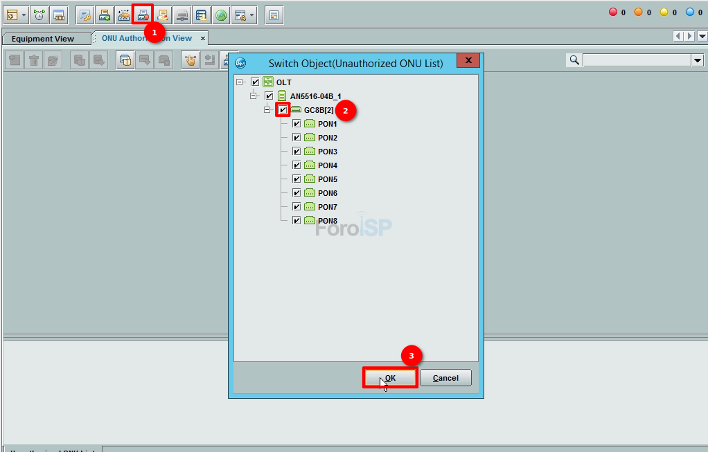 Para comenzar a autorizar las ONUS, colóquese en Obtain Unauthorized ONU y seleccionamos la tarjeta, una vez seleecionada la tarjeta se selecciona todo y damos OK.