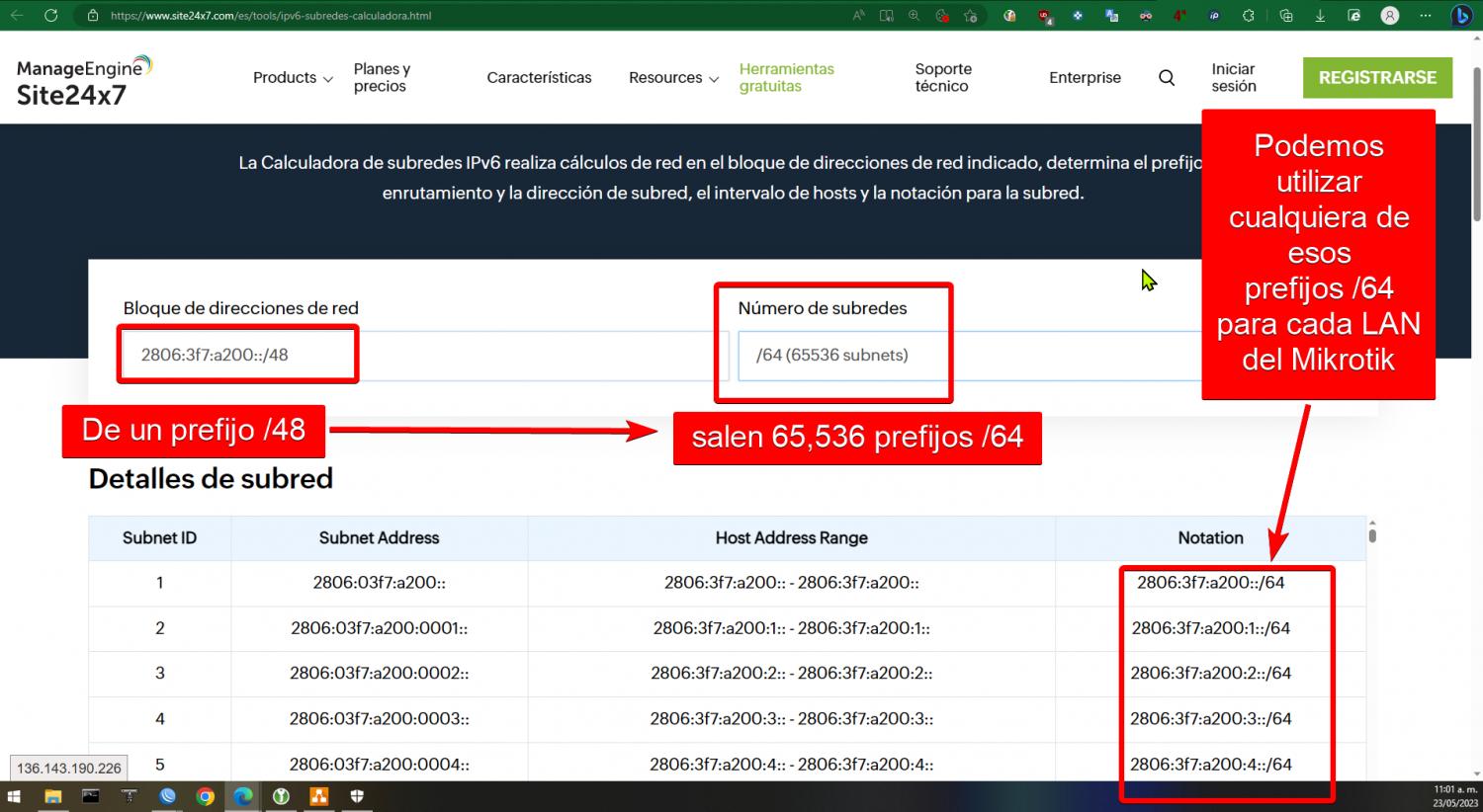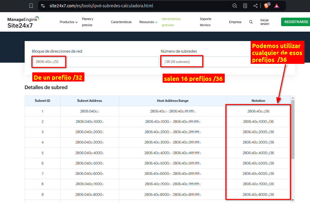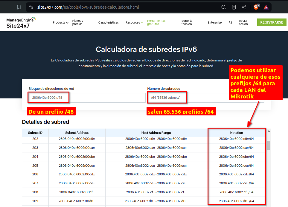 Antes de continuar al siguiente paso vamos a explicar brevemente como vamos a distribuir el prefijo /48 que nuestro carrier nos esta entregando. Para ellos podemos ir al sitio web https://www.site24x7.com/es/tools/ip...lculadora.html