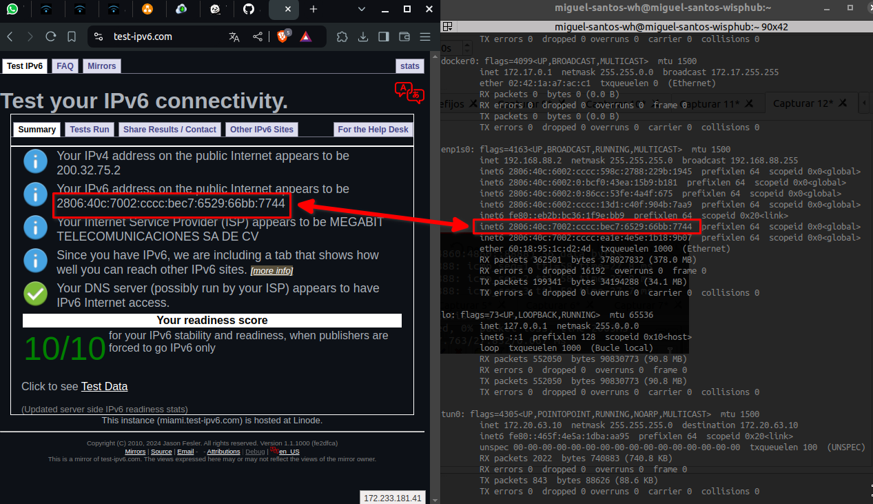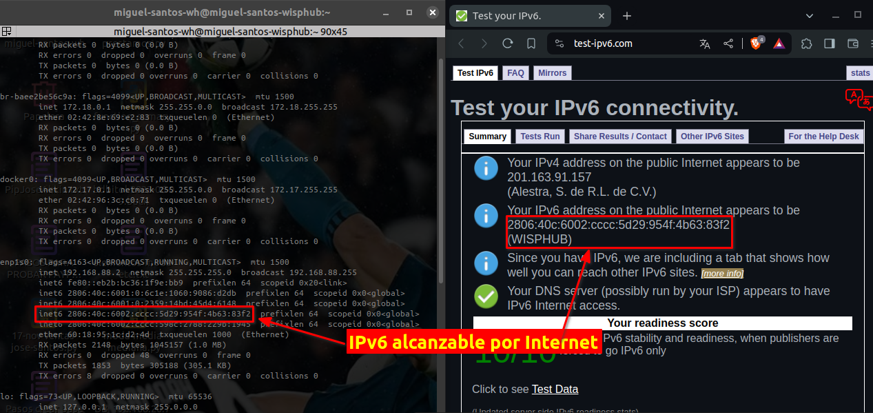 De igual forma podemos abrir un navegador web e ir hacia la siguiente URL https://test-ipv6.com/. En este sitio nos hacen un test que validará que nuestra salida a Internet con IPv6 sea correcta.