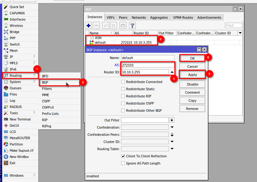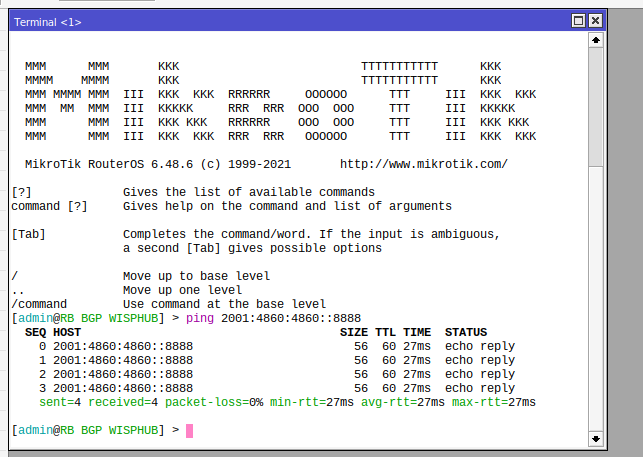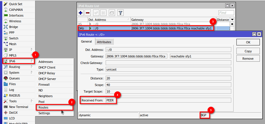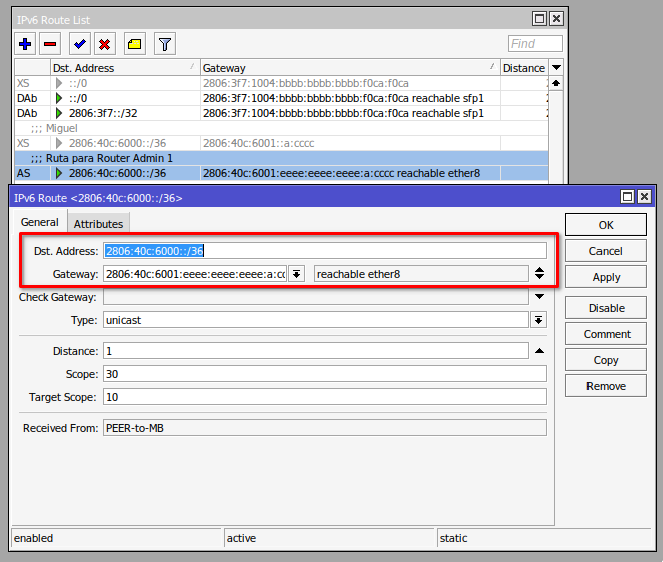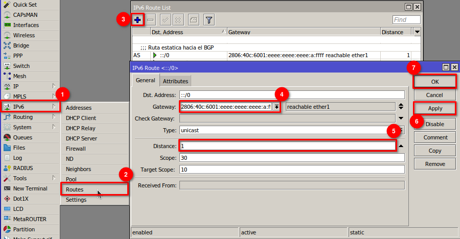 /ipv6 route add comment="Ruta estatica hacia el Carrier" distance=1 gateway=2806:3f7:1002::ffff:f0ca:f0ca