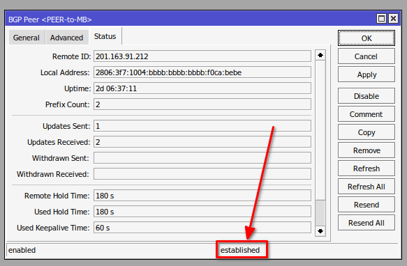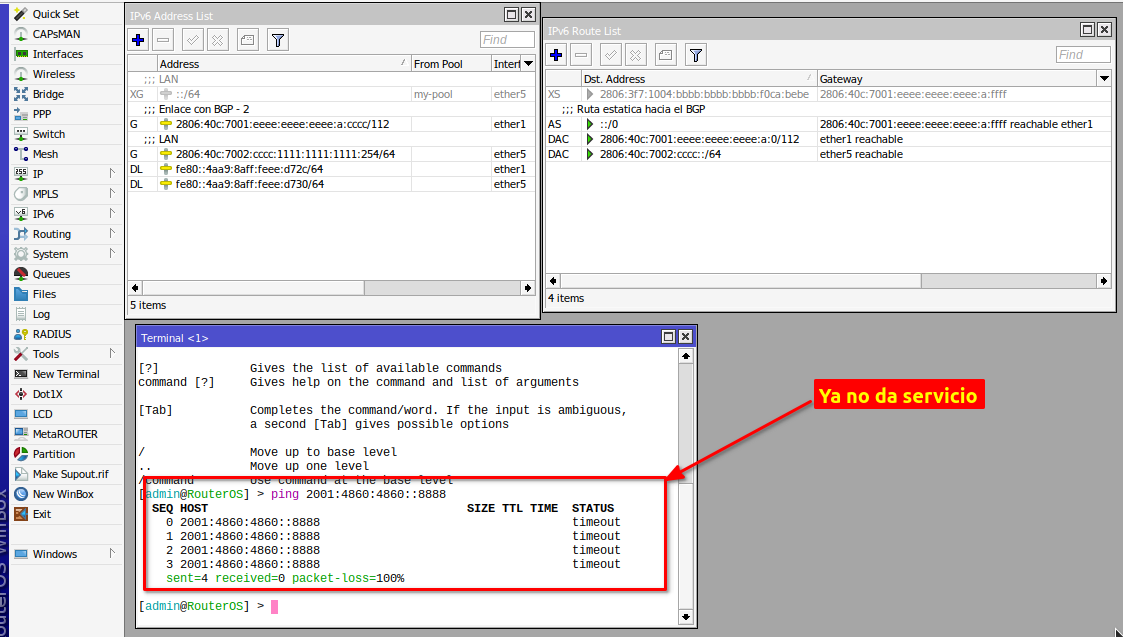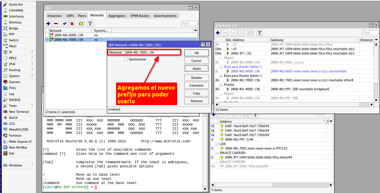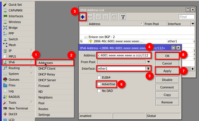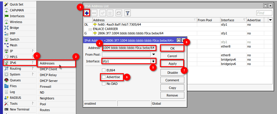 /ipv6 addressadd address=2806:3f7:1002::ffff:f0ca:bebe/112 advertise=no comment=Enlace-con-CARRIER interface=ether1