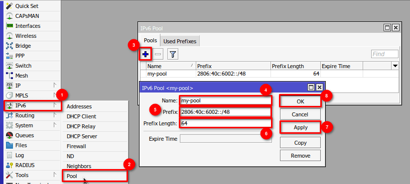 Lo segundo es agregar nuestro prefijo /48 a un pool de Mikrotik.