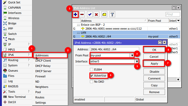 /ipv6 address add comment=LAN from-pool=my-pool interface=ether5