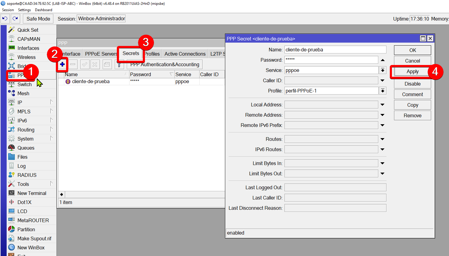 add name=cliente-de-prueba password=12345 profile=perfil-PPPoE-1 service=pppoe