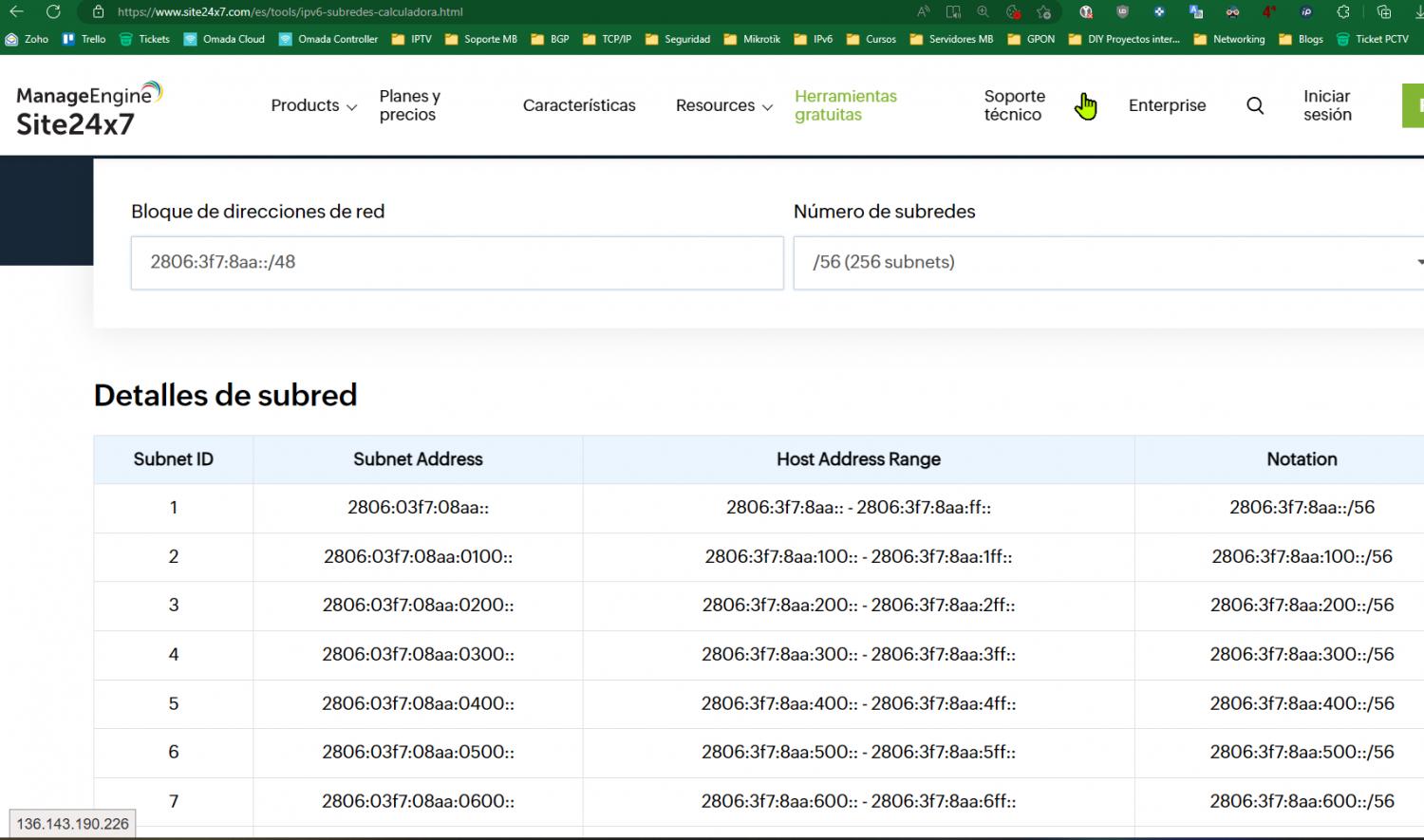 En esta página podemos subnetear el prefijo. Como podemos apreciar de un /48 salen 256 prefijos /56.