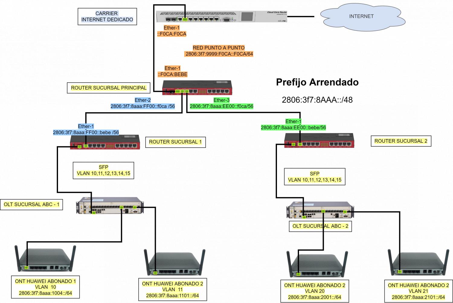 EQUIPO INTERFACE DIRECCIONAMIENTO DESCRIPCION ROUTER SUCURSAL PRINCIPAL ETHER-1 2806:3F7:9999:F0CA::F0CA/64 Enlace Punto a Punto con el router del Carrier ROUTER SUCURSAL PRINCIPAL ETHER-2 2806:3f7:8AAA:FF00::F0CA/56 Enlace Punto a Punto con el router de Sucursal-1 ROUTER SUCURSAL PRINCIPAL ETHER-3 2806:3f7:8AAA:EE00::F0CA/56 Enlace Punto a Punto con el router de Sucursal-2 ROUTER SUCURSAL 1 ETHER-1 2806:3f7:8AAA:FF00::BEBE/56 Enlace Punto a Punto con el router de Sucursal Principal ROUTER SUCURSAL 1 VLAN-10 2806:3f7:8AAA:1000::1/56 Gateway para las ONTs de la VLAN-10 ROUTER SUCURSAL 1 VLAN-11 2806:3f7:8AAA:1100::1/56 Gateway para las ONTs de la VLAN-11 ROUTER SUCURSAL 1 VLAN-12 2806:3f7:8AAA:1200::1/56 Gateway para las ONTs de la VLAN-12 ROUTER SUCURSAL 1 VLAN-13 2806:3f7:8AAA:1300::1/56 Gateway para las ONTs de la VLAN-13 ROUTER SUCURSAL 1 VLAN-14 2806:3f7:8AAA:1400::1/56 Gateway para las ONTs de la VLAN-14 ROUTER SUCURSAL 1 VLAN-15 2806:3f7:8AAA:1500::1/56 Gateway para las ONTs de la VLAN-15 ROUTER SUCURSAL 2 ETHER-1 2806:3f7:8AAA:EE00::BEBE/56 Enlace Punto a Punto con el router de Sucursal Principal ROUTER SUCURSAL 2 VLAN-20 2806:3f7:8AAA:2000::1/56 Gateway para las ONTs de la VLAN-20 ROUTER SUCURSAL 2 VLAN-21 2806:3f7:8AAA:2100::1/56 Gateway para las ONTs de la VLAN-21 ROUTER SUCURSAL 2 VLAN-22 2806:3f7:8AAA:2200::1/56 Gateway para las ONTs de la VLAN-22 ROUTER SUCURSAL 2 VLAN-23 2806:3f7:8AAA:2300::1/56 Gateway para las ONTs de la VLAN-23 ROUTER SUCURSAL 2 VLAN-24 2806:3f7:8AAA:2400::1/56 Gateway para las ONTs de la VLAN-24 ROUTER SUCURSAL 2 VLAN-25 2806:3f7:8AAA:2500::1/56 Gateway para las ONTs de la VLAN-25