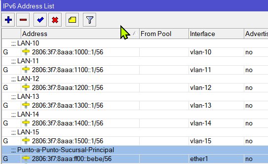 add address=2806:3f7:8aaa:ff00::bebe/56 advertise=no comment=Punto-a-Punto-Sucursal-Principal interface=ether1
