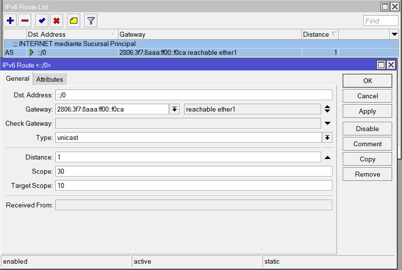 add comment="INTERNET mediante Sucursal Principal" distance=1 gateway=2806:3f7:8aaa:ff00::f0ca