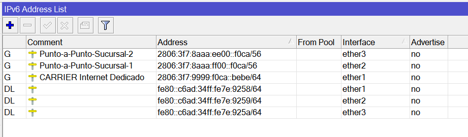 add address=2806:3f7:9999:f0ca::bebe advertise=no comment="CARRIER Internet Dedicado" interface=ether1