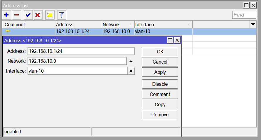 add address=192.168.10.1/24 interface=vlan-10 network=192.168.10.0
