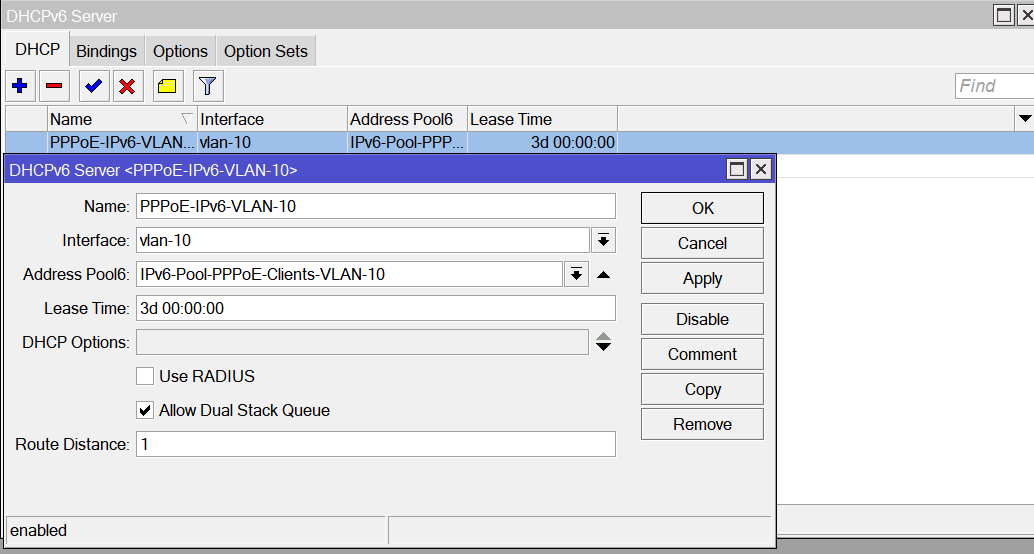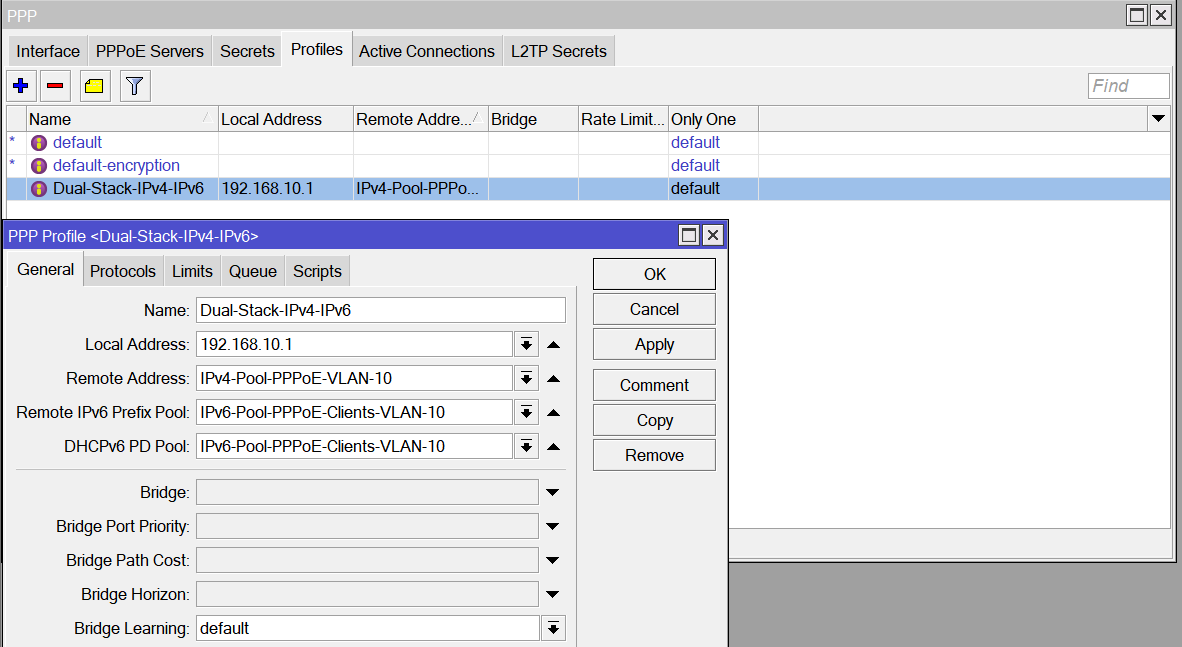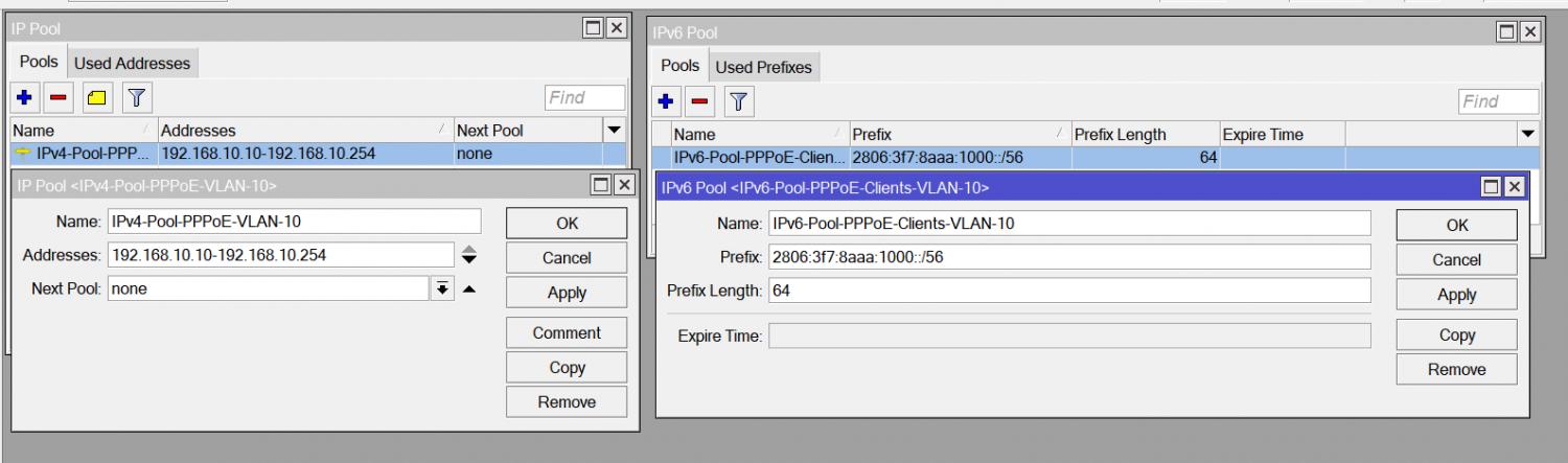 add dhcpv6-pd-pool=IPv6-Pool-PPPoE-Clients-VLAN-10 dns-server=8.8.8.8 local-address=192.168.10.1 name=Dual-Stack-IPv4-IPv6 remote-address=IPv4-Pool-PPPoE-VLAN-10 remote-ipv6-prefix pool=IPv6-Pool-PPPoE-Clients-VLAN-10