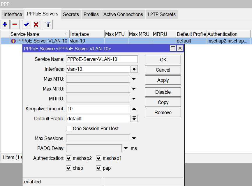 add disabled=no interface=vlan-10 service-name=PPPoE-Server-VLAN-10