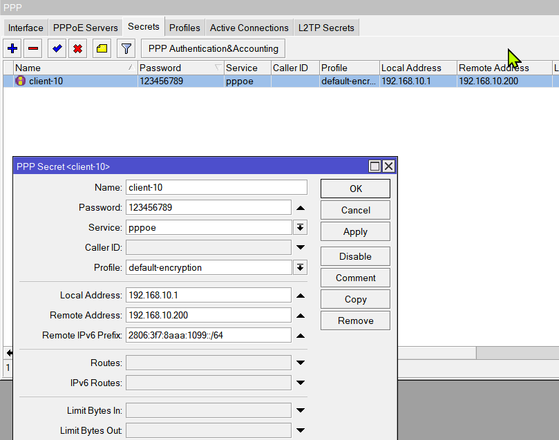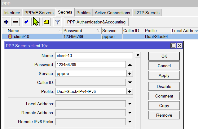 add name=client-10 password=123456789 profile=Dual-Stack-IPv4-IPv6 service=pppoe