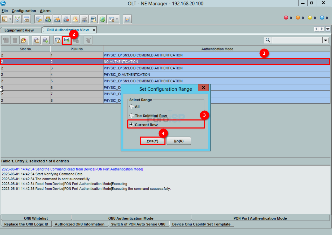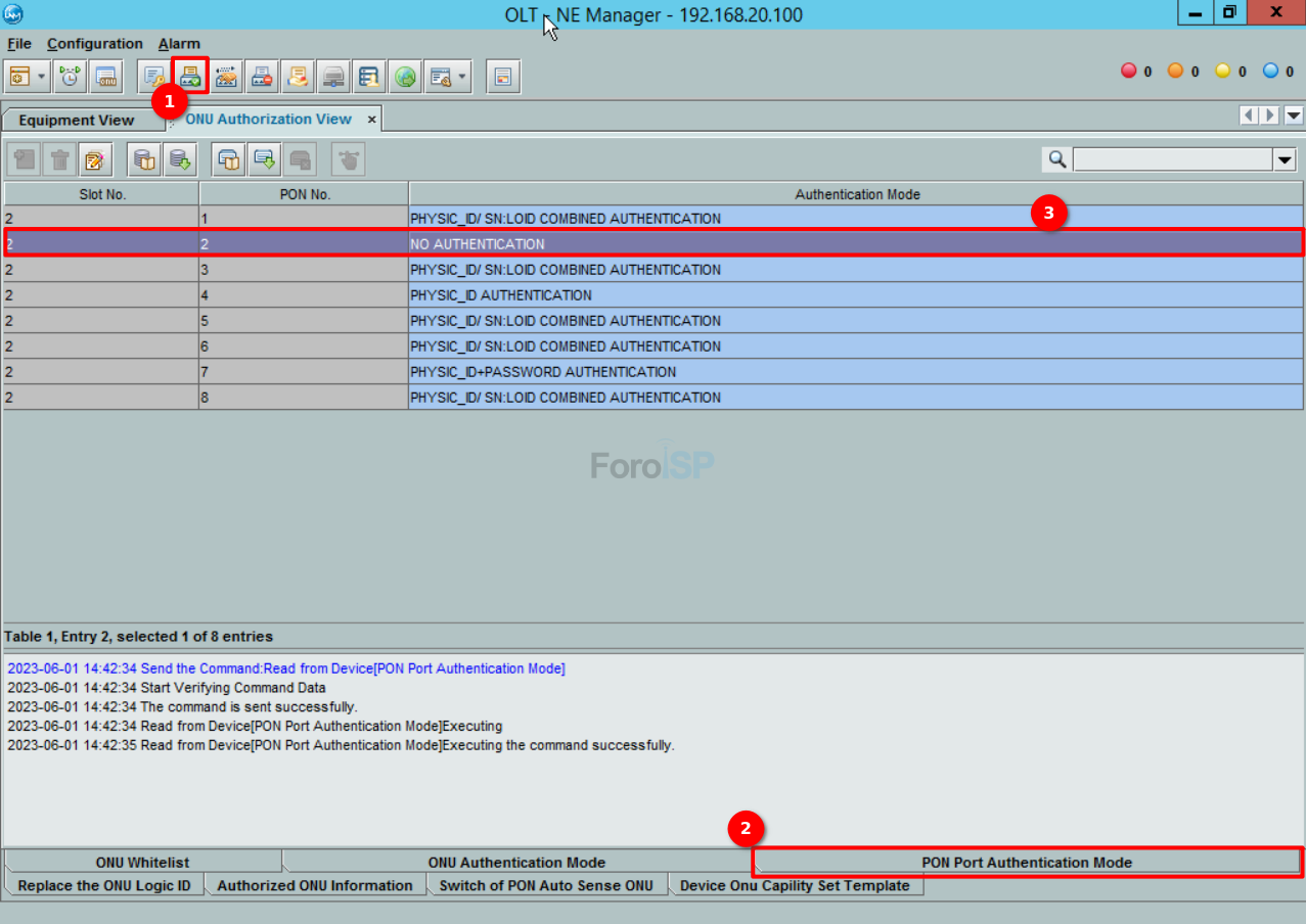 Una vez haya iniciado sesión en la OLT, usualmente el modo de autorización está de forma manual (PHYSIC_ID/SN:LOID COMBINED AUTHENTICATION), cambie el modo a No Authentication , en este caso usaremos el 2/2.