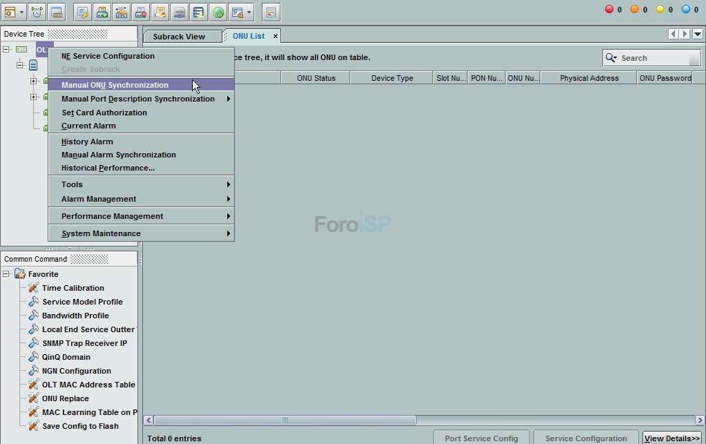 Para poder ver las ONUs autorizadas debemos de ir a ONU List y aplicar click derecho a OLT | Manual ONU Synchronization