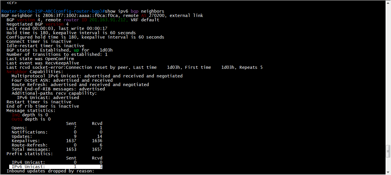 En esta salida lo que podemos apreciar es si nuestra sesión BGP se ha establecido y cuántas rutas nos está enviando nuestro carrier,