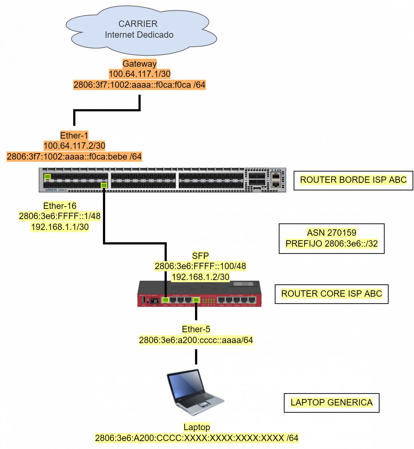 La diferencia entre este manual y el anterior (BGP. Realizar peering eBGP usando Mikrotik.) es que ahora el router de core usará el puerto SFP para conectarse al switch Arista. Todo lo demás permanece exactamente igual.