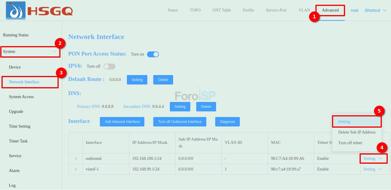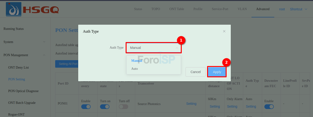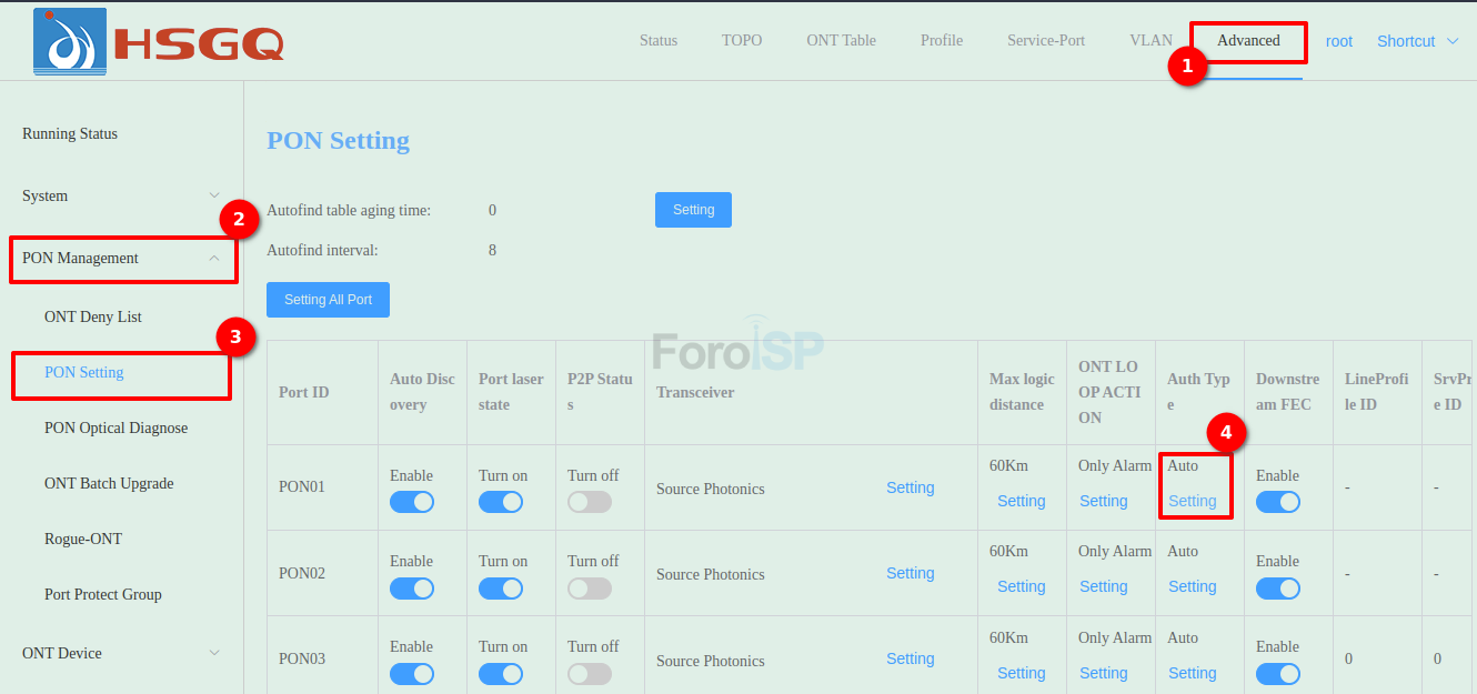 Advanced | PON Managemet | PON Setting