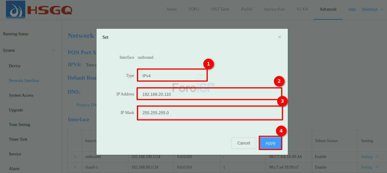 - PORT ID: Seleccionamos el Puerto correspondiente, en este ejemplo PON01