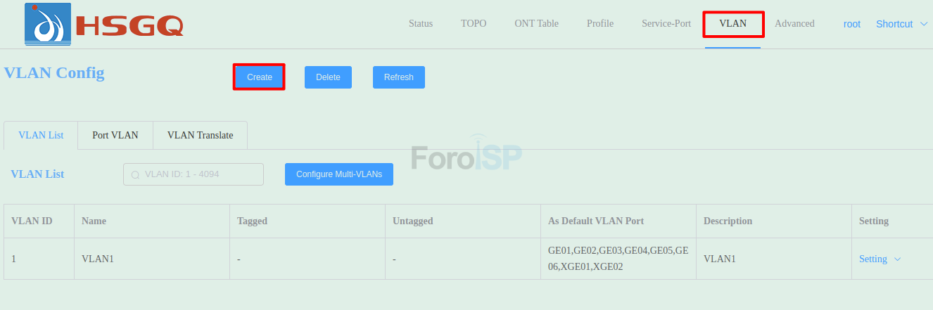 Como siguiente paso cree la configuración de Service Port Auto donde agregara la VLAN recién creada a las columnas C-VLAN y S-VLAN. Esto se hace porque la OLT agrega automáticamente un Service Port a cualquier ONU al momento de autorizarla, si desea modificar la información de ese Service Port, entonces colóquese en: