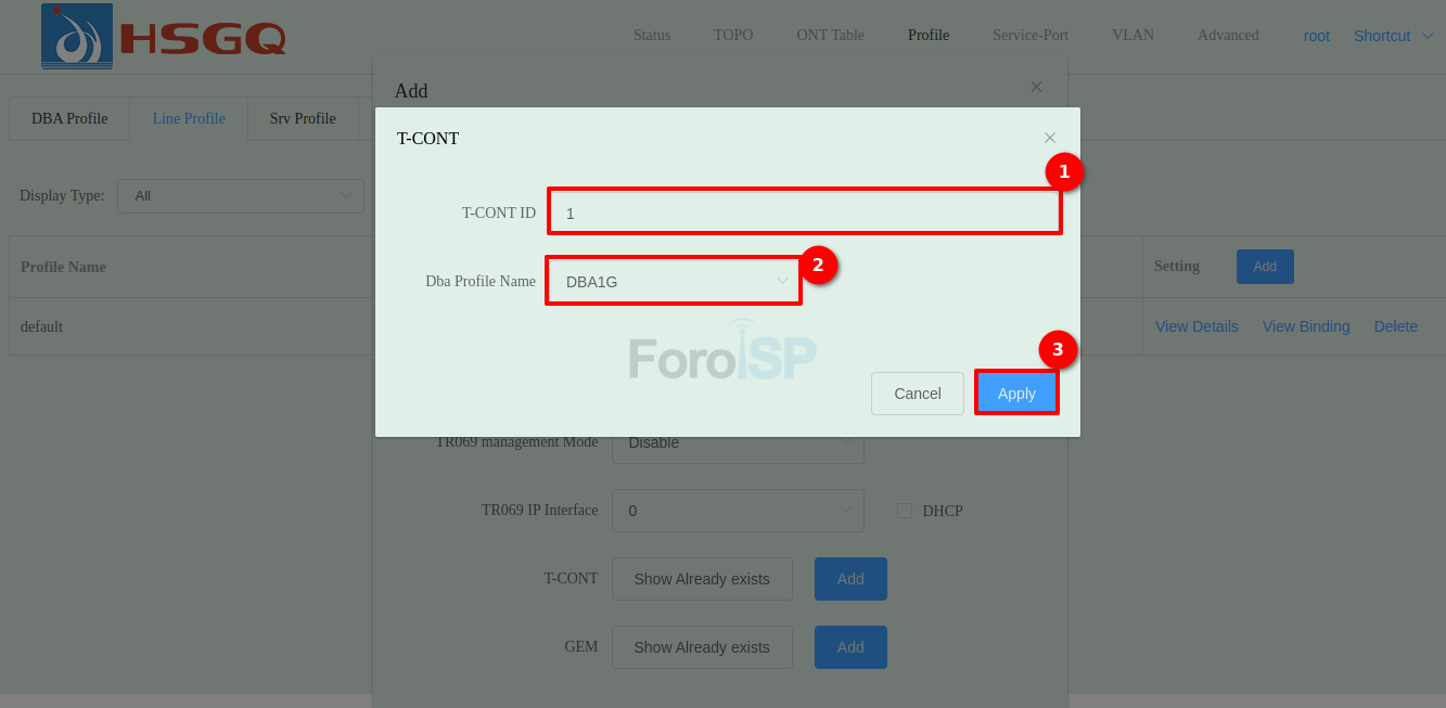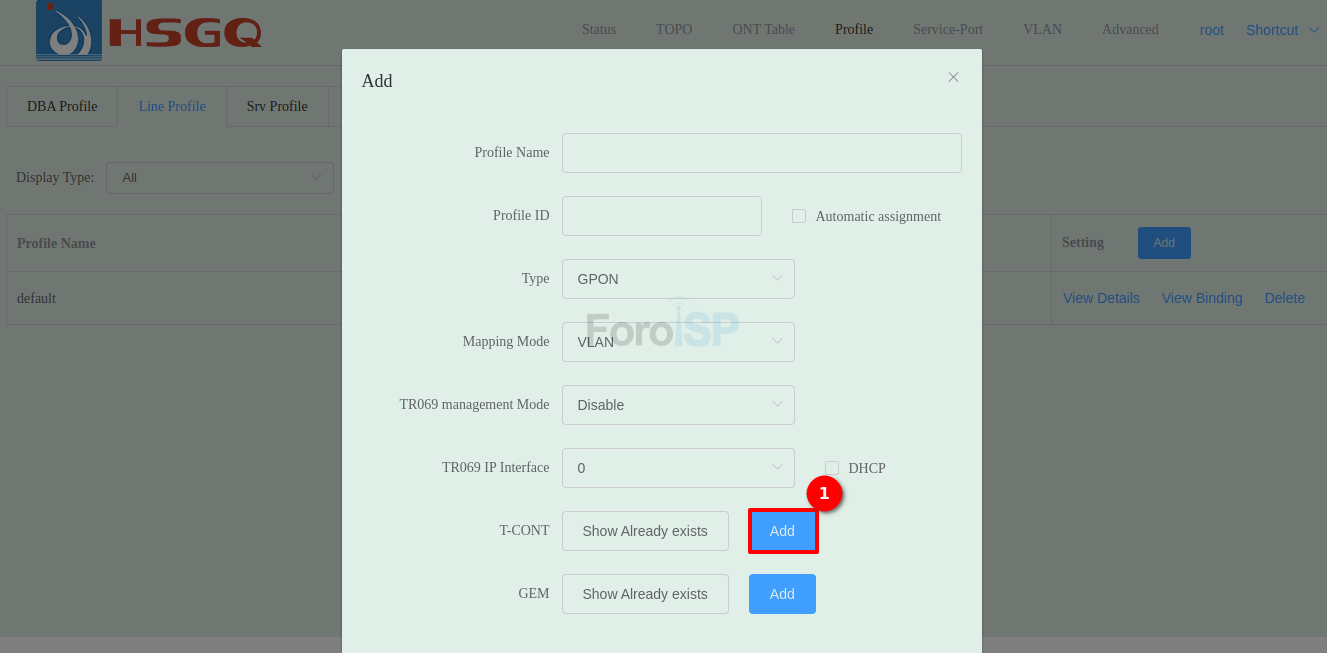 La OLT ya cuenta con un Line Profile creado, así que nosotros usaremos el ID 1. Colóquese en: