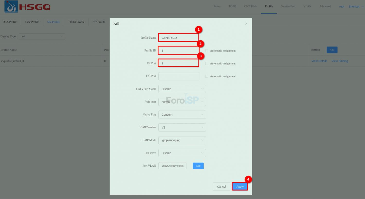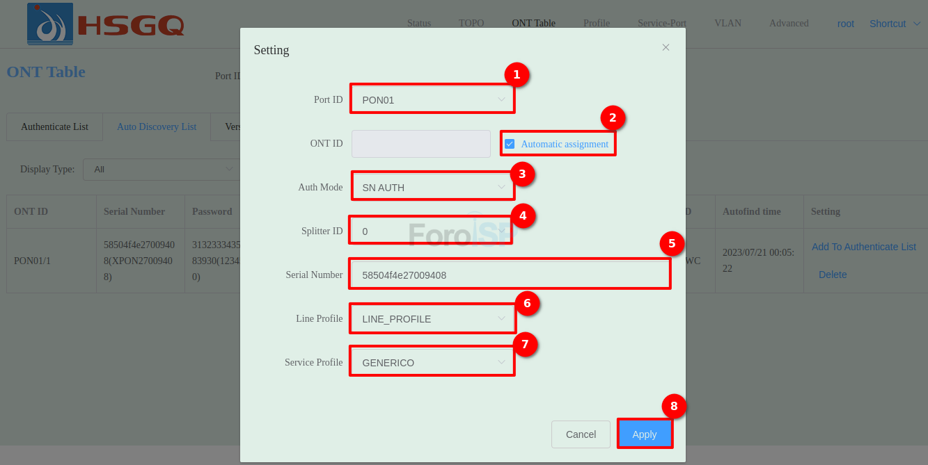 - ONT ID: Seleccionamos el ID correspondiente o podemos seleccionar Automatic Assignment