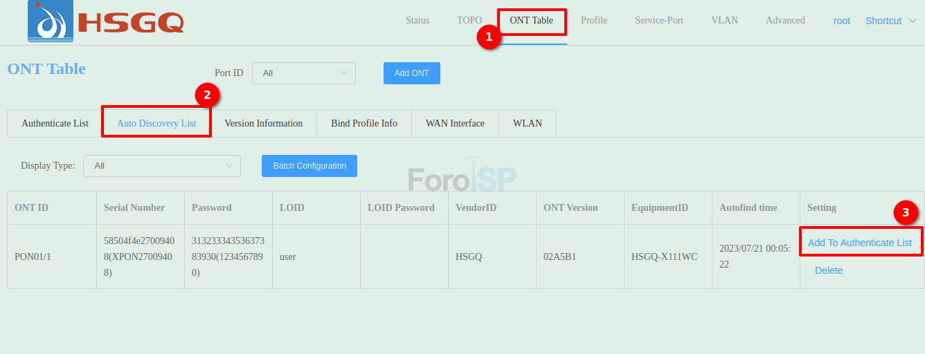 ONT Table | Auto Discovery List