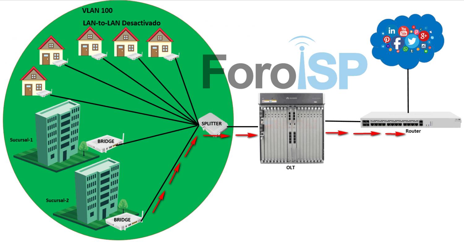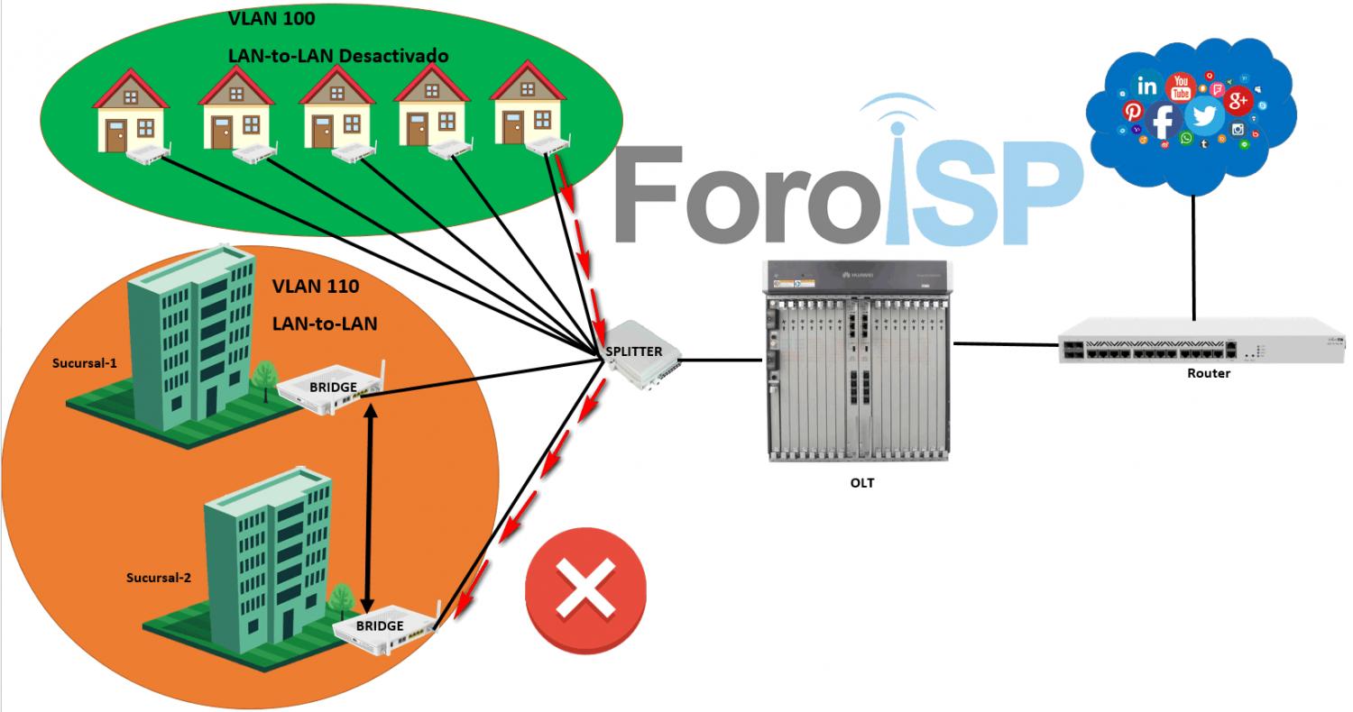 Recordemos que ahora las sucursales están comunicadas entre ellas, pero siguen en una VLAN aislada del resto de la red. Esto siempre lo debemos manejar así para evitar que nuestras Onus del resto de los clientes puedan comunicarse con las Onus de las sucursales.